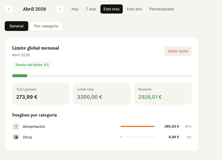 Define límites por categoría o global y recibe avisos antes de excederte.